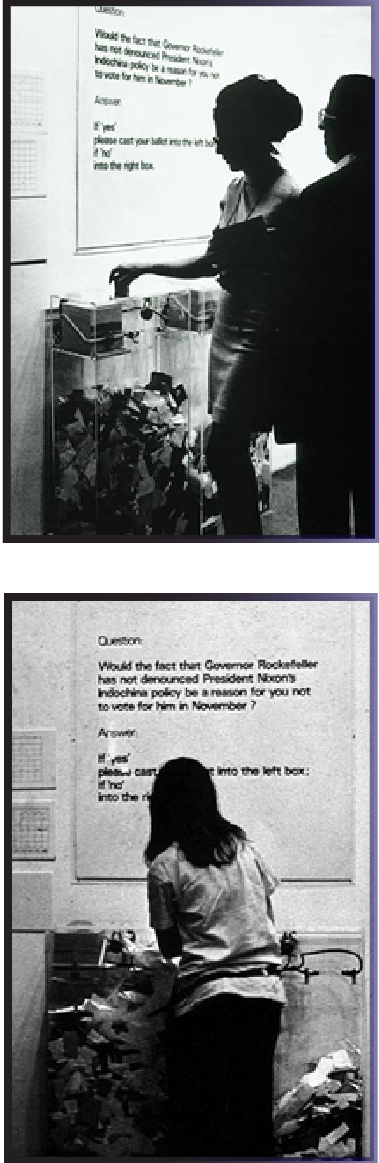 ავტორმა მას განმარტებაც წაუმძღვარა: „სისტემა, როგორც ხელოვნება: კითხვა, ალგორითმი პასუხებისთვის, ვიზუალური უკუგება“. კედელზე იყო წარწერა: „თქვენს გადაწყვეტილებაზე - ნოემბრის არჩევნებზე ხმა მისცეთ ნელსონ როკფელერს, იმოქმედებს თუ არა ის ფაქტი, რომ გუბერნატორი როკფელერი ინდოჩინეთში რიჩარდ ნიქსონის პოლიტიკას არ გმობს?“ გამოფენის დამთვალიერებლებს შეეძლოთ აერჩიათ პასუხი: „დიახ” ან „არა”, და ბიულეტენი სპეციალურ ორგმინის ყუთებში ჩაეგდოთ.