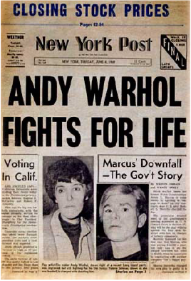 1968 წლის ივნისში, რადიკალმა ფემინისტმა ვალერი სოლანასმა, (ტრაქტატის ავტორი, რომელიც მხარს უჭერს მამაკაცების განადგურებას) ესროლა მას და თითქმის ფატალური ჭრილობა მიაყენა. ის, რომ სოლანასმა, რომელსაც კაცები სძულს, უორჰოლი თავის მსხვერპლად აირჩია კურიოზულია, რადგან უორჰოლი არასოდეს აცხადებდა, რომ იყო და არც სურდა, რომ ყოფილიყო მასკულინურობის ეტალონი. გავრცელებულია მოსაზრება, რომ სოლანასის არჩევანი განაპირობა უორჰოლის ცნობილმა ფრაზამ თხუთმეტი წუთიანი დიდების და ცნობადობის შესახებ "In the future, everyone will be world-famous for 15 minutes.", რეალურად ფრაზა რომელიც უორჰოლს არ ეკუთვნის და ბრენდინგის გამო კურატორებმა მიაწერეს, საბედისწერო გამოდგა.