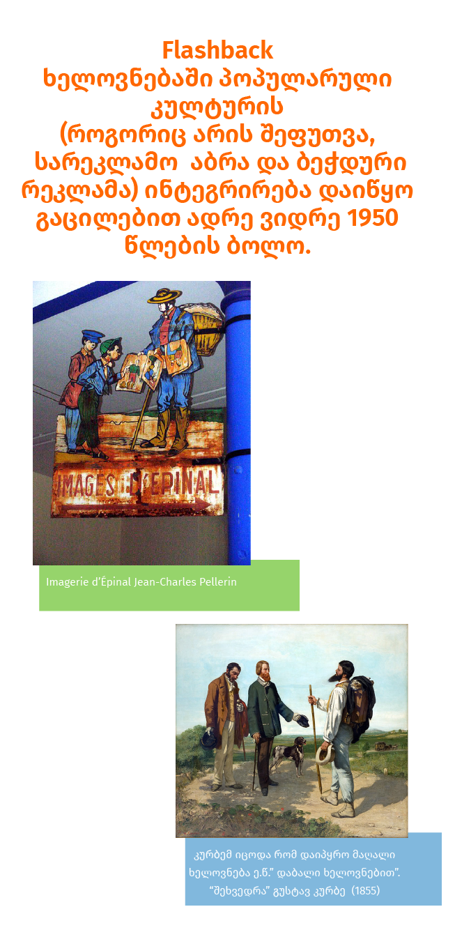 ხელოვნებაში პოპულარული კულტურის ( როგორიც არის შეფუთვა, სარეკლამო აბრა და ბეჭდური რეკლამა) ინტეგრირება დაიწყო გაცილებით ადრე ვიდრე 1950-ანი წლებია. მე-19 საუკუნეში ფრანგი მხატვრის გუსტავ კურბეს ნამუშევარი „Bonjour, Mr. Courbet“ (1855 წელი) წარმოადგეს სიმბოლურ რეფერენციას იმ დროინდელ მას კულტურაზე. ამ შემთხვევაში საუბარია ძალიან იაფასიან ჟან პელერინის (Jean-Charles Pellerin) გრავიურების სერიაზე ე.წ. „Imagerie d’Épinal“. გრავიურები წარმოადგენდა მორალისტურ, დიდაქტიკურ სცენებს ყოველდღიური ქუჩის ცხოვრებიდან, ომის გმირებთან დაკავშირებულ ისტორიებს და ა.შ. ეს იმიჯები კარგად ნაცნობი იყო იმდროინდელი საზოგადოებისთვის. გაიგო თუ არა საშუალო კლასის წარმომადგენლებმა კურბეს ხრიკი მას არ აინტერესებდა, მაგრამ კურბემ იცოდა რომ დაიპყრო მაღალი ხელოვნება ე.წ. დაბალი ხელოვნების საშუალებით. უკვე მოგვიანებით იგივე სტრატეგიას მიმართა პაბლო პიკასომ, როდესაც 1914 წელს გააკეთა კოლაჟი Bon Marché Au Bon Marché.( ცნობილი ფრანგული მაღაზია) ეს იყო პიკასოს პასუხი, ერთგვარი ირონია „ შოპაგოლიკობაზე“. მარსელ დიუშანმა პიკასოს კონსუმერისტული ხუმრობა კიდევ უფრო განავრცო როდესაც თავისი რედი მეიდი- Ready-Made სახელწოდებით შადრევანი გამოფენაზე წარმოადგინა. პოპ არტის ძირითადი მახასიათებლები ცნობადი იმიჯები პოპულარული მედიიდან და სხვადასხვა ტიპის სამომხმარებლო პროდუქტები.მკვეთრი ფერები. ბრტყელი გამოსახულება (კომიქსებისა და ჟურნალ-გაზეთების ფოტოების გავლენა). გმირები: კომიქსების წიგნებიდან, რეკლამებიდან და გასართობი ჟურნალებიდან.