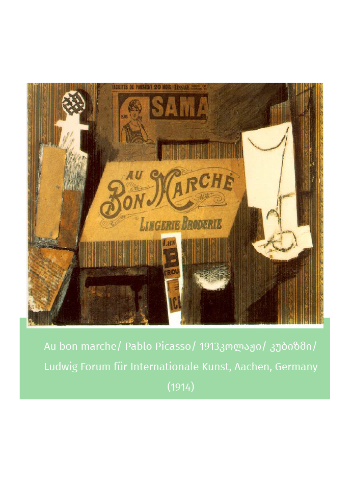 Au Bon Marché წარმოადგენს საუკეთესო მაგალითს ახალი ხედვის ილუსტრაციისთვის. ზღვარის წაშლა ხელოვნებას და ყოველდღიურობას შორის და ხელოვნებას და არა ხელოვნებას შორის ან თუნდაც რეფერენციას ახალ პარადიგმაზე რომელსაც მარსელ დიუშამი დანერგავს. ამ კოლაჟში პიკასო ზღვარს მაღალ და დაბალ ხელოვნებას შორის შლის არამარტო გამოყენებული მასალით,არამედ სახელწოდებითაც.Bon marché არის ფრანგული ტერმინი,რაც ნიშნავს "კარგ გარიგებას"(იგულისხმება ნაკლები ფასის გადახდა ანუ სიიაფე) და ასევე არის ცნობილი პარიზის უნივერმაღის სახელი. კოლაჟის ზედა ნაწილში, მისი კონკურენტი პარიზის უნივერმაღის, Samaritaine-ის რეკლამა გვთავაზობს კოლაჟების კიდევ ერთ მუდმივ თემას: მითითებებს ბრენდის პროდუქტებზე, მასმედიაზე,რეკლამებსა და კომერციაზე. ბევრმა ხელოვანმა, დადაისტებით დაწყებული და დღემდე,გამოიყენა პაბლო პიკასოსა და ჟორჟ ბრაკის ეს მიდგომა, როგორც კრიტიკული სტრატეგია ხელოვნების სამყაროსა და თანამედროვე საზოგადოების კომერციული ღირებულებების ეჭვქვეშ დასაყენებლად.ხოლო ამერიკულმა პოპარტმა, როგორც მხატვრული ფორმა, რომელიც გასაგები და მისაღებია ფართო მასებისთვის.