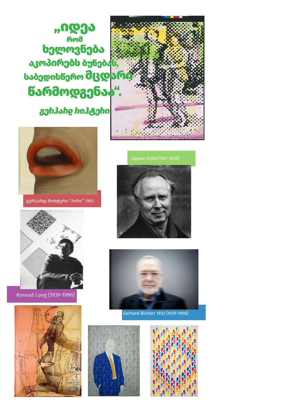 https://www.youtube.com/watch?v=bH2cx8hAgJs Gerhard Richter https://www.youtube.com/watch?v=0GE30hI8X78 Sigmar Polke https://www.youtube.com/watch?v=4Tak22Rl554