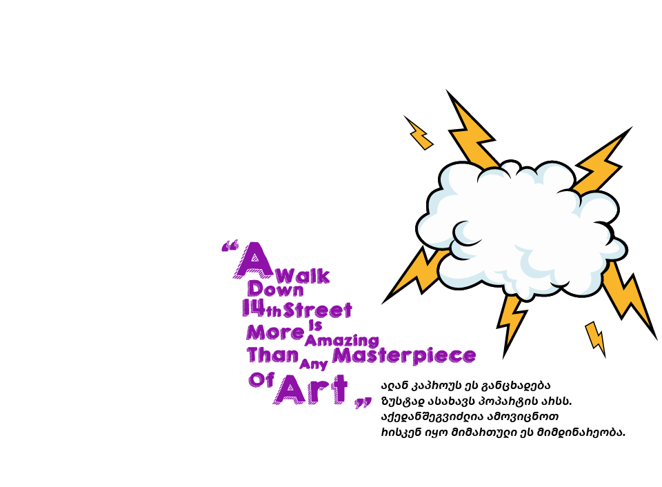“A walk down 14th street is more amazing than any masterpiece of art” ალან კაპროუს ეს განცხადება ზუსტად ასახავს პოპ არტის არსს. აქედან შეგვიძლია ამოვიცნოთ რისკენ იყო მიმართული ეს მიმდინარეობა.