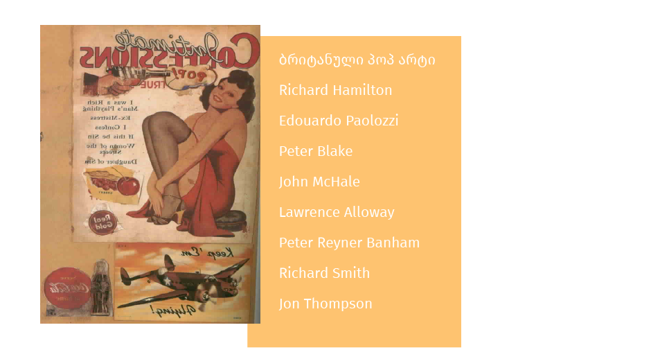 „პოპ მხატვრები ქმნიან გამოსახულებას, რომელისაც ნებისმიერ გამვლელი სწარაფად შეიცნობს: კომიქსები, პიკნიკის მაგიდები, კაცის შარვლები, ვარსკვლავები, მაცივრები და კოლას ბოთლები“